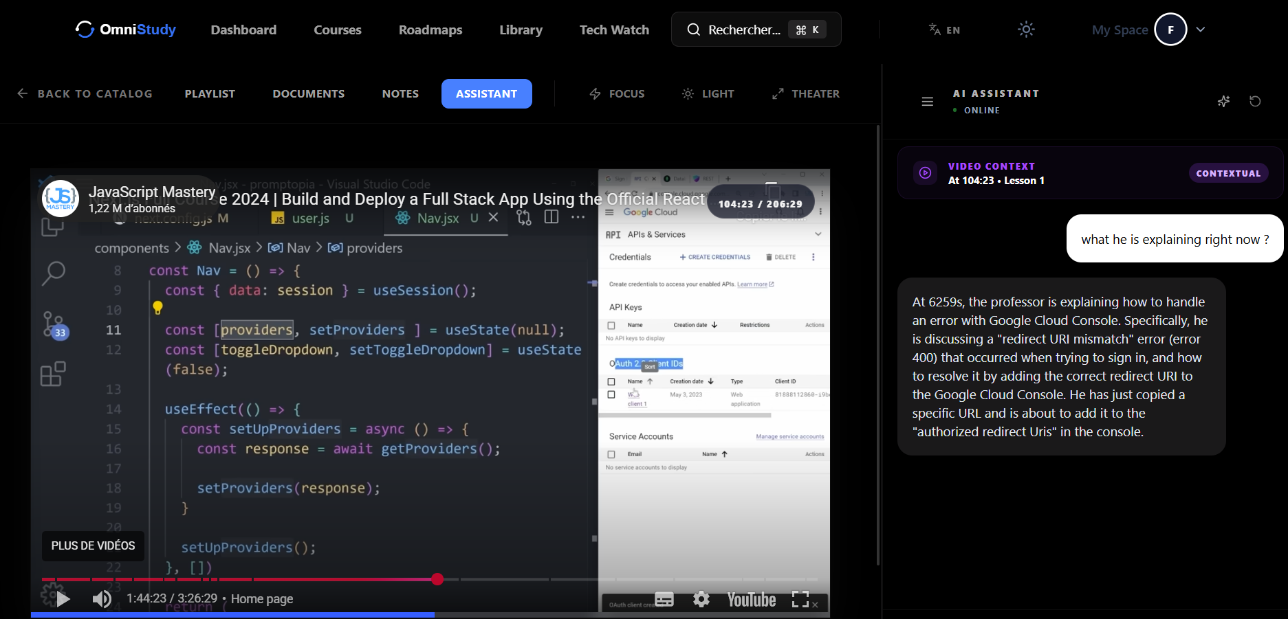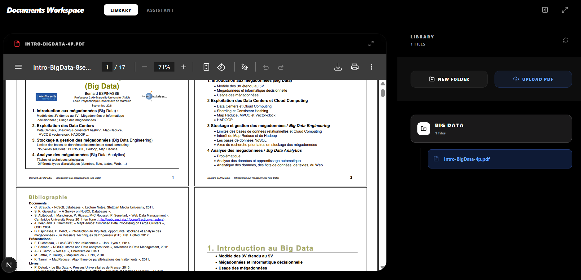 Your personal assistant, always present. Ask questions about video context or documents without leaving the lesson.